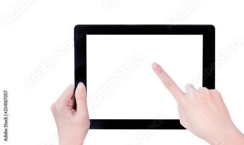 tablet, hold, white, screen, pad, woman, finger, pointing, touch, using, scroll, isolated, blank, computer, background, portable, device, social, media, app, smartphone, mobile phone, smart, mobile, phone, female, application, click, people, person, clipping, path, cut-out, closeup, horizontal, business, laptop, digital, technology, touch screen, electronic, book, showing, monitor, hand, contraption, girl, display, cyberspace