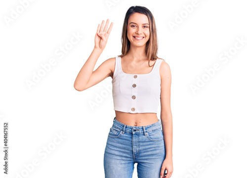 Young beautiful girl wearing casual sleeveless t shirt showing and pointing up with fingers number four while smiling confident and happy.