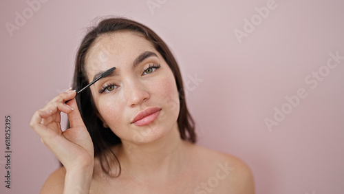 Young beautiful hispanic woman applying make up on eyelashes over isolated pink background