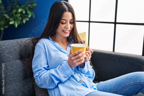 Young beautiful hispanic woman drinking coffee sitting on sofa at home