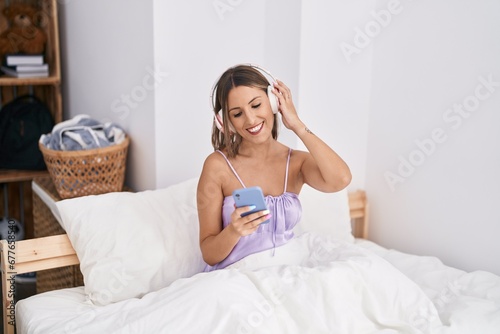 Young beautiful hispanic woman listening to music sitting on bed at bedroom