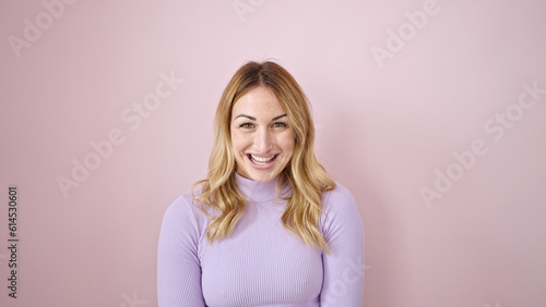 young, hispanic, woman, female, person, portrait, adult, beautiful, blond, latin, happy, happiness, confident, cheerful, confidence, looking, cool, smile, lifestyle, expression, positive, joy, smiling, laughing, enjoy, fun, funny, laugh, racked, standing, fashion, casual attire, camera, isolated, background, wall, pink, cut-out