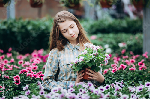 young beautiful long-haired girl in a greenhouse with colorful flowers petunias in spring
