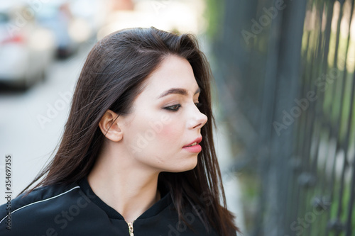 woman, portrait, young, beautiful, beauty, face, hair, people, brunette, green, model, person, outdoors, 1, eye, smile, smiling, white, fashion, nature, teenage, cute, park, summer, dark-haired, make-up, honed, caucasian, girl, cosmetic, well-being, human, constructed, sensual, clean, coiffure, elegance, lady, shoulder, pretty, female, modern