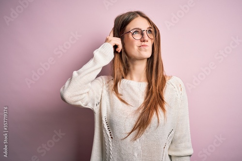 Young beautiful redhead woman wearing casual sweater and glasses over pink background confuse and wondering about question. Uncertain with doubt, thinking with hand on head. Pensive concept.