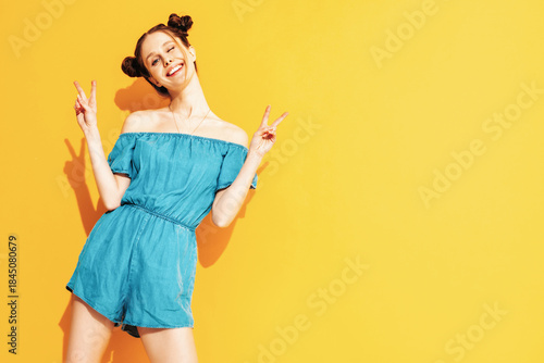 Young beautiful smiling female in trendy summer jeans overalls. Sexy carefree woman with two horns hairstyle posing near yellow wall in studio. Positive model having fun. Isolated