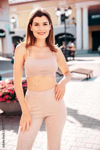Young beautiful smiling woman in trendy summer clothes. Sexy carefree model posing on the street background at sunset. Positive brunette female. Cheerful and happy. In Europe city