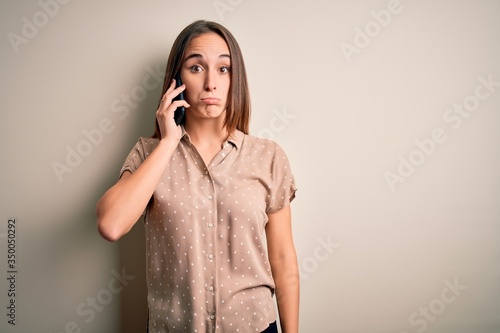 Young beautiful woman having conversation talking on the smartphone over white background depressed and worry for distress, crying angry and afraid. Sad expression.