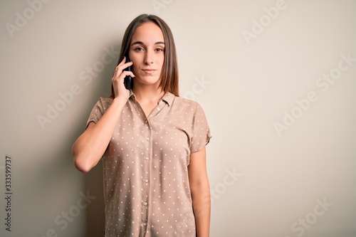 Young beautiful woman having conversation talking on the smartphone over white background Relaxed with serious expression on face. Simple and natural looking at the camera.