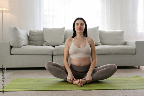 Young beautiful woman on second trimester of pregnancy doing yoga. Close up of pregnant female in sitting on a mat in lotus pose and meditating. Healthy pregnancy concept. Background, copy space.