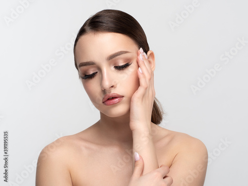 woman, face, portrait, make-up, eye, brow, care, skin, lip, girl, model, natural, make up, beauty, beautiful, luxury, female, closeup, cosmetic, skincare, elegant, honed, trendy, nice, dry, moisturise, hair, remove, removal, contour, treatment, salon, concept, therapy, soft, cosmetology, hand, touching, clean, facial, beautician, healthy, fashion, young, modern, cute, pretty, looking, caucasian, head shot