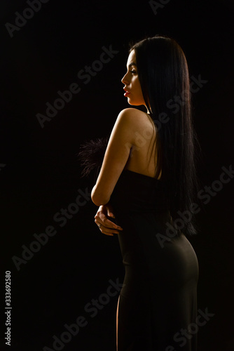 Young beautiful woman wear black evening dress. girl with naked shoulders posing over black background. Portrait of elegant young woman in black elegant dress. skincare and makeup. nice black dress