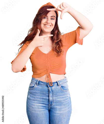 Young beautiful woman wearing casual clothes smiling making frame with hands and fingers with happy face. creativity and photography concept.