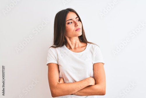Young beautiful woman wearing casual t-shirt standing over isolated white background looking to the side with arms crossed convinced and confident