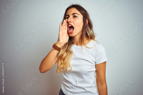 Young beautiful woman wearing casual white t-shirt over isolated background shouting and screaming loud to side with hand on mouth. Communication concept.