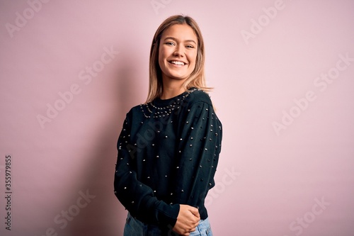 Young beautiful woman wearing fashion urban clothes, model wearing casual street style standing over pink background