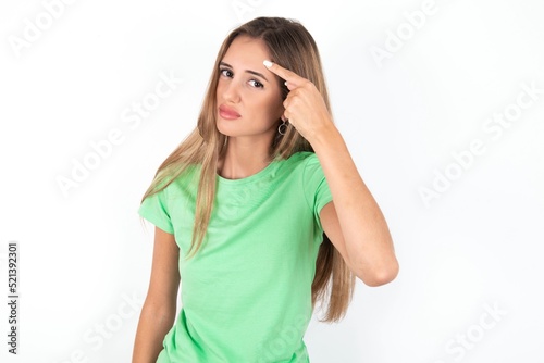 young beautiful woman wearing green T-shirt over white background, pointing unhappy at pimple on forehead, blackhead infection. Skincare concept.