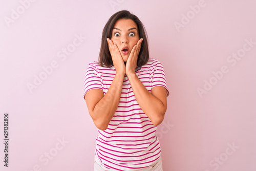 Young beautiful woman wearing striped t-shirt standing over isolated pink background afraid and shocked, surprise and amazed expression with hands on face
