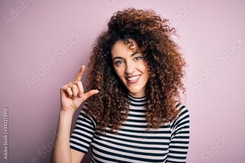 Young beautiful woman with curly hair and piercing wearing casual striped t-shirt smiling and confident gesturing with hand doing small size sign with fingers looking and the camera. Measure concept.