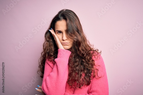 Young beautiful woman with curly hair wearing casual sweater over isolated pink background thinking looking tired and bored with depression problems with crossed arms.