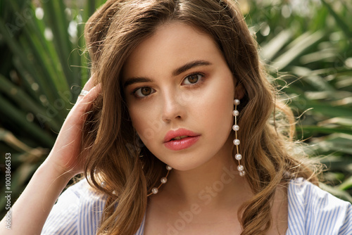 Young beautiful woman with perfect skin and big pearl earrings and curly hair front of greens plants. Close up, selective focus.