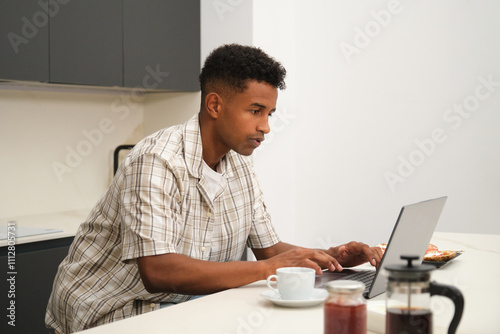 black, african american, ethnic, home, laptop, kitchen, relaxed, modern, lifestyle, technology, man, hot drink, breakfast, casual attire, domestic, interior, young, human relationships, communication, workspace, leisure, together, bond, partnership, male, domesticity, morning, informal, serene, environment, connection, scene, indoor, companion, oneness, computing, calmness, light, simplicity, curly hair, half face