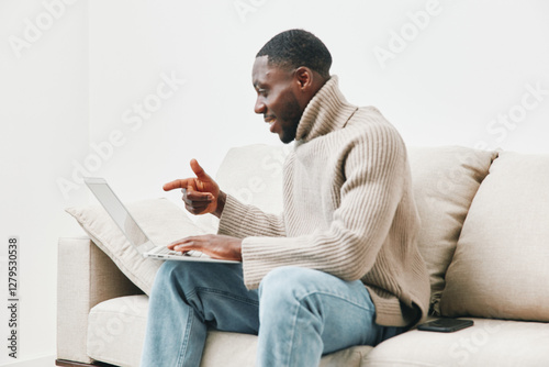 Young Black man in a cozy sweater joyfully working on a laptop at home, showcasing a relaxed atmosphere and modern interior design