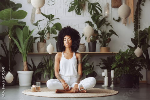 woman, young, black, meditating, yoga, healthy, health, lifestyle, wellness, meditation, pose, zen, balance, spiritual, relaxation, harmony, stability, condensed, relaxing, asana, calm, mind, well-being, peaceful, mindfulness, home, indoor, room, interior, contemporary, design, modern, decoration, plant, houseplant, potted, green, lamp, female, african american, alone, 1, sitting, floor, eyes closed, people, person