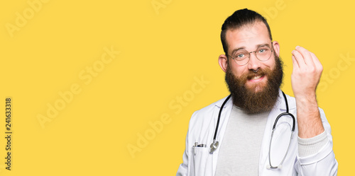 Young blond doctor man with beard wearing medical coat Doing Italian gesture with hand and fingers confident expression