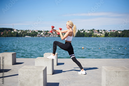 Young blond fit woman, wearing black leggings and white top, training outside by city lake, doing lunges on concrete platform, holding red weights. Female power training in summer. Healthy lifestyle