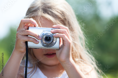 Young blond girl holding digital camera and photographing