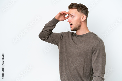 Young blonde caucasian man isolated on white background with surprise expression while looking side