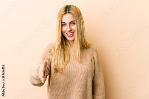 Young blonde caucasian woman stretching hand at camera in greeting gesture.