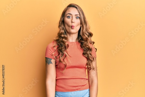 Young blonde girl wearing casual clothes making fish face with lips, crazy and comical gesture. funny expression.