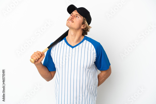 activity, adult, background, ball, bat, blond, caucasian, concept, equipment, eye, game, head, isolated, leisure, look, male, man, man, people, person, play, recreation, sport, studio, thinks, thinking, thoughtful, training, up, young, youth, baseball, looking