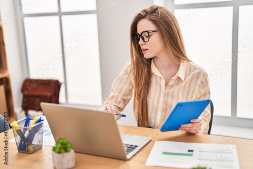 Young blonde woman business worker using laptop and touchpad working at office