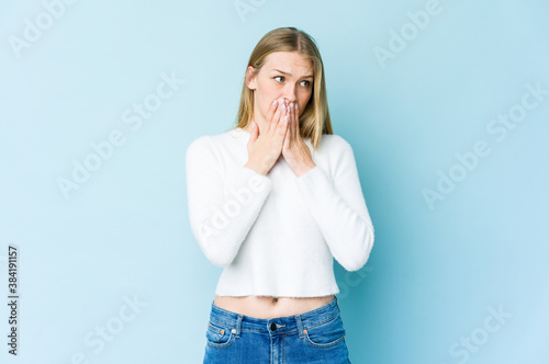 Young blonde woman isolated on blue background thoughtful looking to a copy space covering mouth with hand.