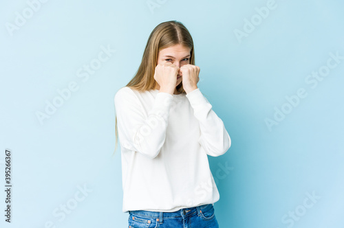 Young blonde woman isolated on blue background throwing a punch, anger, fighting due to an argument, boxing.