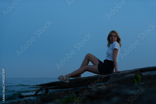Young blonde woman on a rocky seashore after sunset. Odessa. Ukraine.