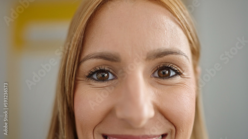 Young blonde woman smiling confident at home