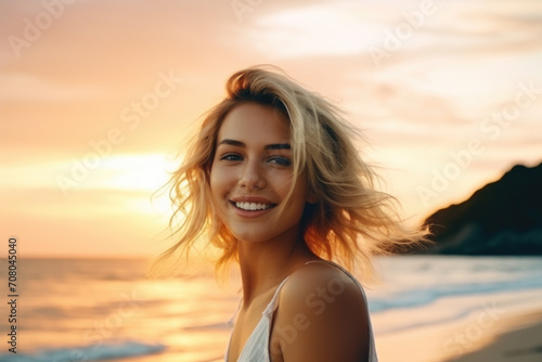 Young blonde woman smiling on the beach at sunset.