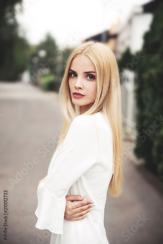 woman, young, portrait, beautiful, beauty, summer, park, happy, hair, blond, nature, outdoors, smiling, white, 1, blond, model, people, person, smile, fashion, face, cute, green, happiness, spring, female, elegance, serious, long hair, standing, looking, dress, day, urban, modern, style, lifestyle, cool, fashion model