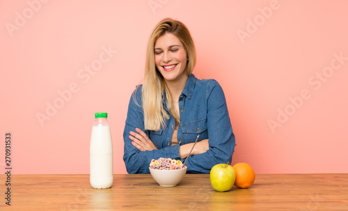Young blonde woman with bowl of cereals laughing