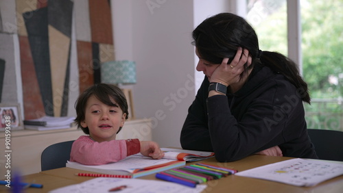 Young boy attentively working on homework while mother provides guidance, colorful pencils and educational materials on the table, illustrating supportive parenting and early education