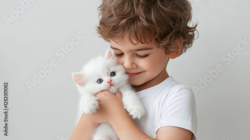 boy, kitten, white, children, affection, gentle, hugs, love, innocence, grey, background, young, tenderness, childhood, pet, caring, friendship, cute, adorable, fluffy, animal, companion, happiness, joy, bonding, little, holding, gaze, eye, plain, softness, warmth, smile, peaceful, connection, closeness, small, furry, serenity