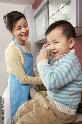 chinese, mother, son, on the phone, family, asian ethnicity, lifestyle, color image, vertical, indoor, people, happiness, cheerful, joy, enjoyment, home, house, kitchen, china, east asia, asia, beijing, eltern, care, love, loving, togetherness, close to, photo, kindergartner, children, cute, development, growth, sitting, smiling, toothy smile, two people, standing, apron, talking, connection, connect, convenience, technology, wireless technology, holding, communication, boy, playful, domestic life, half face, looking away