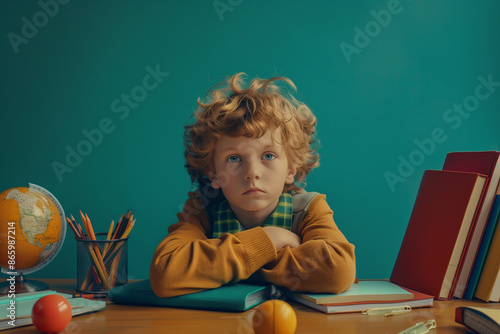 young boy sits at a desk with a book and a cup of water. He looks tired and is staring at the camera