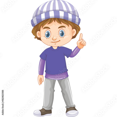 boy, children, children, young, male, person, human, people, childhood, innocent, happy, joyful, playful, cute, adorable, friendly, energetic, active, standing, pointing, finger, telling, explaining, teaching, learning, education, school, illustration, drawing, cartoon, vector, graphic, art, design, isolated, transparent, background, white, clothing, fashion, beanie, hat, t-shirt, pant, sneaker, casual attire, outfit, purple, grey