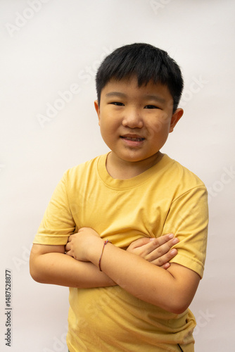 boy, children, young, male, asian, smiling, cheerful, confident, arms crossed, yellow shirt, casual attire, portrait, studio, white background, short hair, front view, standing, relaxed, happy, positive, friendly, innocent, playful, cute, charming, joyful, expressive, bright, simple, clean, minimalistic, fashion, style, trendy, modern, youth, innocence, personality, attitude, pose, gesture, emotion, happiness, content, peaceful, serene, calm, gentle, warm