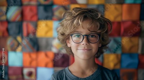Young boy with glasses, beaming against a colorful abstract background, perfect for bright and cheerful wallpapers.